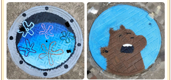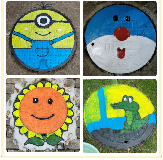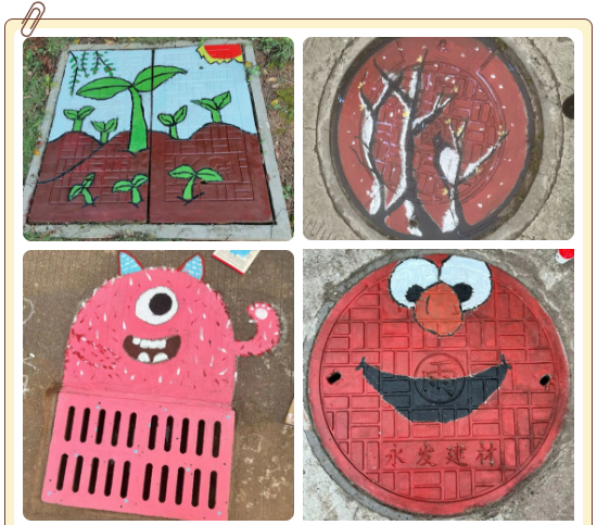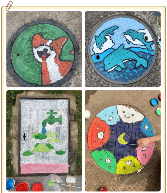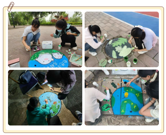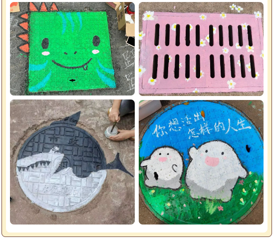 在图案设计上,志愿者们以无尽的创意和匠心独运,赋予了每一个井盖独特的生命力和艺术感;在色彩运用上,志愿者们将美学发挥到了极致,让每一幅图画鲜活欲出。他们巧妙地将校园文化、生活等元素融入其中,创造出了一幅幅既富有美感又富含深意的图案,让人在欣赏之后回味无穷。绚丽的色彩让井盖更加醒目,传递出了青春、活力与积极向上的校园文化气息。