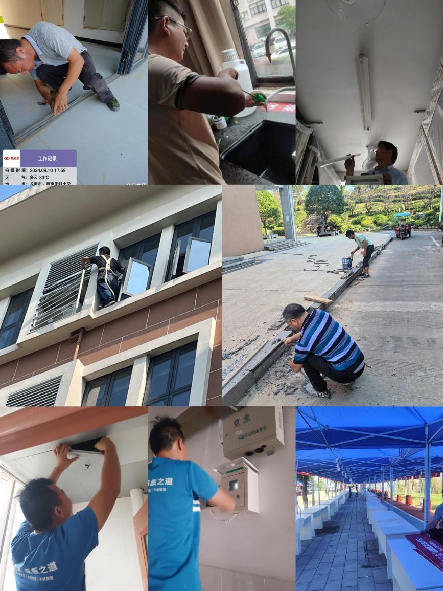 暑假期间,后勤维修中心、水电中心、直饮水热供中心、章贡校区和龙南校区后勤物业中心奋战高温,加班加点完成教学楼、学生宿舍改造维修、设备更新维护及运行检查,保证了开学和迎新的使用要求。迎新期间各中心还提前与供水供电部门衔接,对三校区的热水系统、配电系统、供水和管道管网系统进行了拉网式安全检查及维修维护,在各学院接待点、集中报到点、缴费处架设好线路、提供插排,确保了新生报到现场用水用电保障。