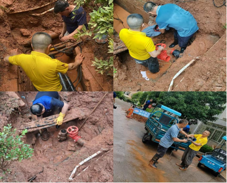 终于,经过艰难挖掘,破裂的水管显露出来。师傅们顾不上擦拭脸上的雨水和汗水,立刻马不停蹄地投入到拆除和更换工作中。他们配合依旧默契十足。切割旧管、安装新管、调试水压…… 每一个环节都严谨细致,每一个动作都干脆利落,只为以最快的速度恢复供水。
