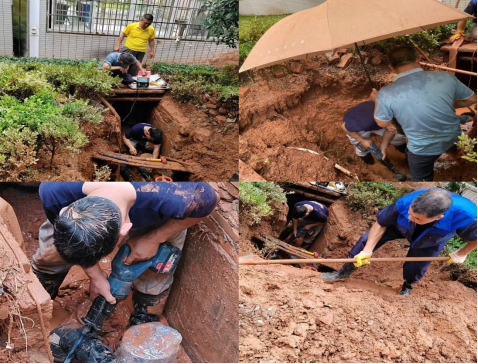 险情就是命令!后勤水电班组接到消息后,迅速集结。面对狂风暴雨,师傅们毫不犹豫地拿起工具,顶着肆虐的风雨冲向现场。到达后,眼前的情况比预想更为棘手:水管爆裂位置较深,加之连日暴雨,周围泥土早已被浸泡得松软泥泞,挖掘工作举步维艰。雨水不断滴落,泥水溅满裤腿,可师傅们全然不顾。他们手持铁锹,一锹一锹地小心挖掘,每一次下锹,都要费力地从黏腻的泥土中拔出;每一次弯腰,都伴随着泥水的滑落,但没有一人退缩。